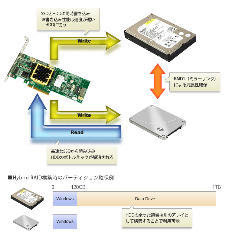 たとえば、1TBのHDDと120GBのSSDをHybrid構成にした場合、CドライブにはHDDとSSDのRAID1環境になり、DドライブにはHDDの余った容量である880GB(1000GB-120GB)のドライブをマウントして使用することが可能です。