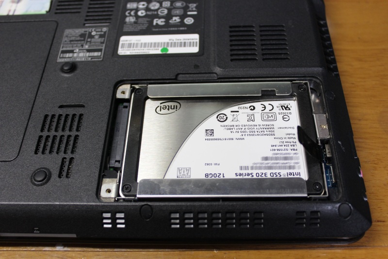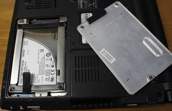 簡単にストレージ部分へアクセスができる。昨年の春に換装したSSD320 300GBのシルバーが美しい。