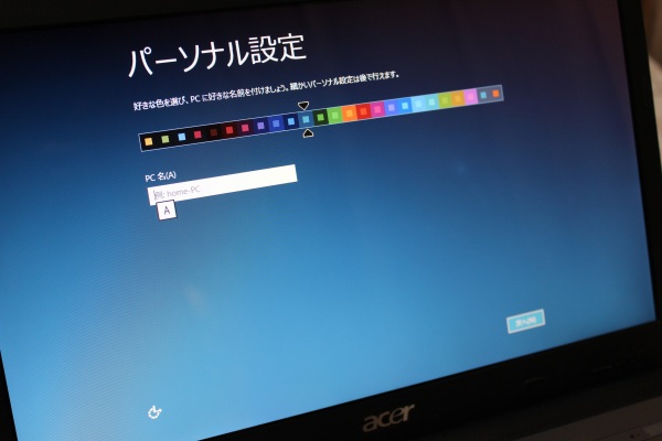 USBメモリがDVDより高速なのもあり、またWindows 8がより高速になったのもあるだろう。このパーソナル設定(ユーザーを追加するセットアップの最終画面に出るまで僅か8分。