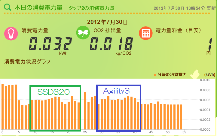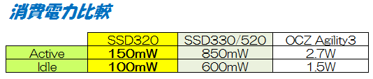SSD320と後継の330やその上位の520、以前私が購入した OCZ Agility3の定格消費電力を比較してみましょう。