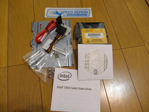 リテールパッケージなので3.5インチドライブベイにSSDをマウントするためのブラケット、SATAおよび電源のケーブルまで入っており、説明書などはも今やあまり見なくなった小さなCDで供給されています。 やっぱりSpeed Demon ステッカー!!