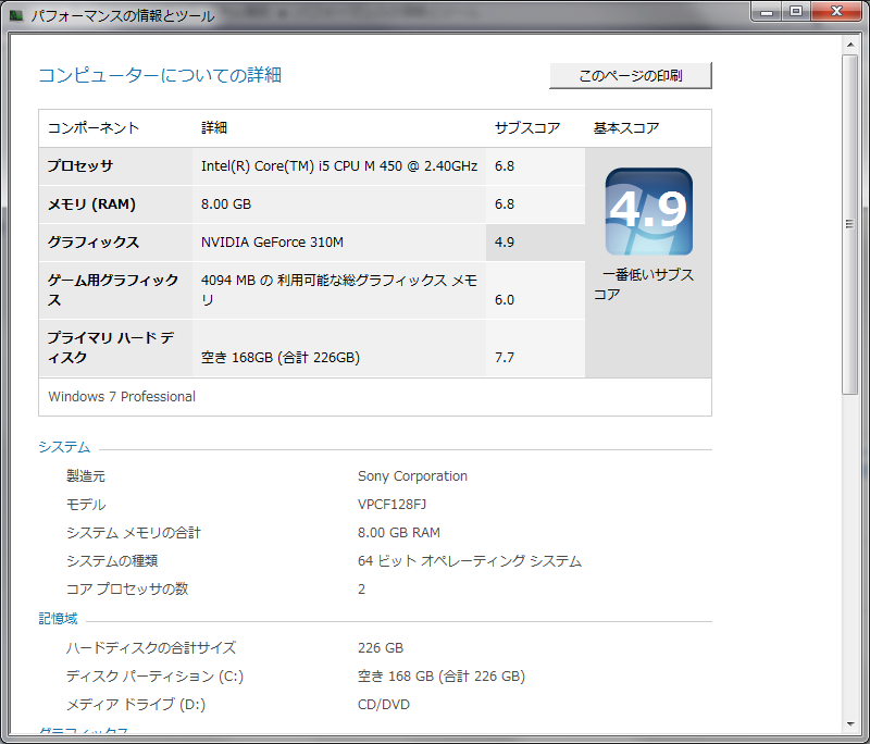 また、写真のようにメモリを8GBに増設し、OSもWin7 HPからWin7 Proにしました。