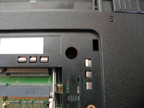 メモリの右上の穴にネジがあります。このネジを外さないと、後でキーボードを取り外す際に外すことが出来なくなります。