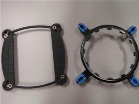 マザーボードの裏にスぺーサーを取り付けたパーツを接着します。
