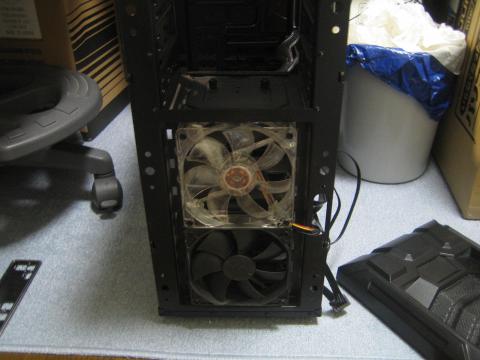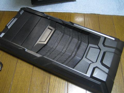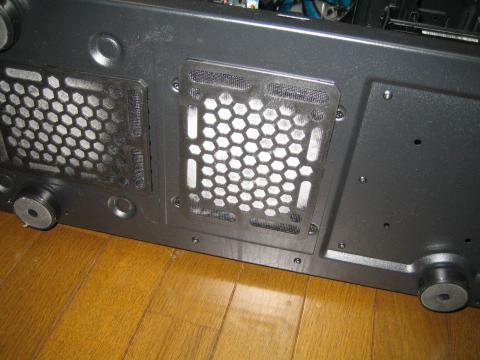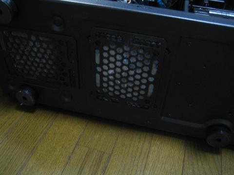 フロント部のマスクの下。上側がケース付属ファンで、下側がジャンク品で購入したファン。埃がかなり入ってしまうようで、後ろのシャドウベイ部分に結構埃積もっちゃってます。なので