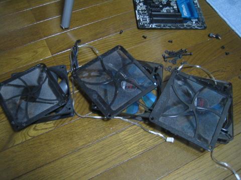 左の一つがリアファン(ジャンク品)。でその他二つがトップファン(ENERMAX T.B.APOLLISH UCTA14N-BL)。うん、なんというか、シルバーストーン製のファンフィルターが無ければ即死だった...