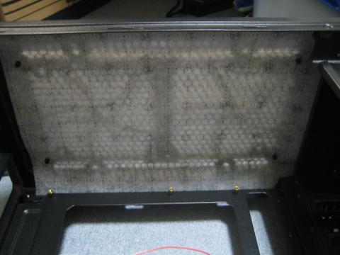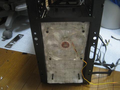 トップファンは外してフィルターだけをつけました。固定方法はネジ用の穴を適当にハサミで突き刺してあけてつけるだけ。ポロリととれそうですが意外と取れにくいです。外側には余ったシルバーストーン製のファンフィルターをつけました。