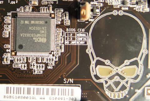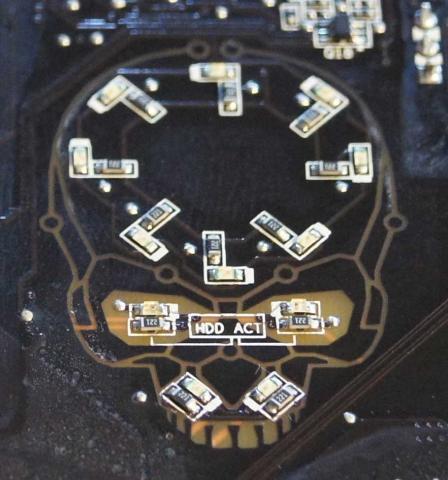 チップセットレベルでは、ついに標準の32bitPCIもサポート外となっているために、IDTのPCIブリッジ89HMPEB383ZAがドクロロゴマークの脇に搭載されている。ちなみにこのドクロロゴマークは背面にLEDなどが仕込まれており怪しく光ってくれる。