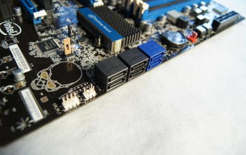 SATAコネクタは横出しタイプ。残念ながらハイエンド系の長めのビデオカードを挿入すると下部に隠れてしまうのでアクセサビリティが良いとは決して言えない。青いコネクタがSATA6.0Gbps対応ポートで黒いコネクタがSATA3.0Gbps対応ポートになり、下側が奇数IDとなっていた。