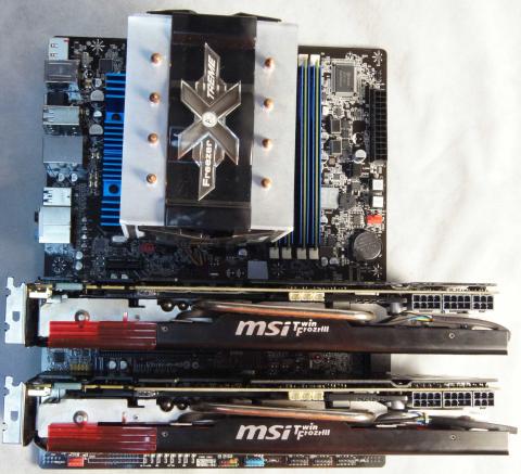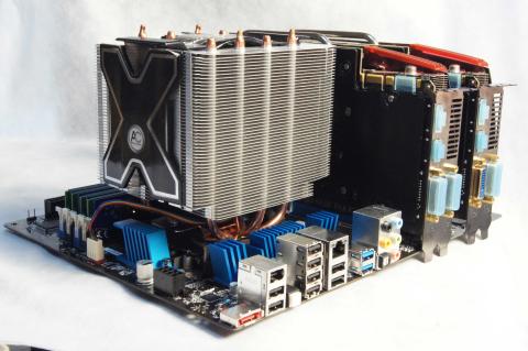 今回はCore i7 2600KとMSI GeForce GTX480を2基、SLI構成で組み合わせた。CPUクーラーにはArctic CoolingのFreezer XTREMEを用意。LGA1155はLGA1156対応のCPUクーラーであれば搭載できるため、1156対応のCPUクーラーであれば利用できる。SLIで構成しても2スロットを占有するGeForceGTX480 LIGHTNINGを利用しても1スロット分の空間が開くので冷却に関しても問題は無い。以前利用していたP55SLIの場合、SLI+PhysX SLIに対応ということでSLIで構成されるGeForce GTX 480の間に空間が無く、2枚のうち1枚のバックプレートを泣く泣く外さなければならない上に、エアフローに大きな問題が生じていた。P55SLIの場合は、SLIに加えPhysX用にもう1枚GeForceを組み合わせることが利点ではあるが、冷却という面からすると、水冷であったり、何かしらのオプションが必要となってしまっていたため、DP67BGのこのスロット構成の方がより汎用的かつ実用的だと言えるのではないだろうか?