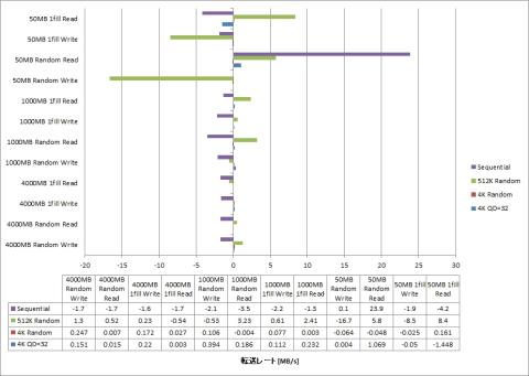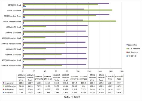 しかし他のファイルサイズでは安定しているので、搭載キャッシュ容量と実際のデータ転送速度、書き込みのアルゴリズムに起因するところなのでしょう。