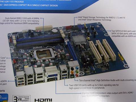 ※1 また、Z68からVirtuが実装されましたが、グラフィックカードもあるという前提なのでVirtuは、後々追記予定。グラフィックカードとZ68上のGPUをうまく統合してくれるものらしく、どちらかにつなぐと、処理はそれぞれのグラフィックス機能を使いながら、繋いだ方の出力からそれぞれの結果が出てくるという夢のような技術。