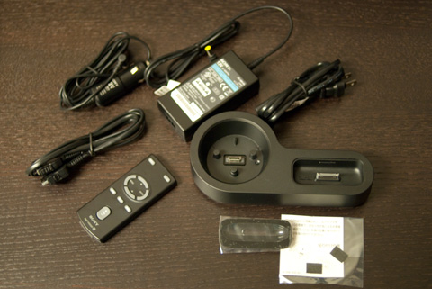 室内で使用する際に接続するドック、リモコン、電源アダプター、シガーライターソケット接続用アダプター等。