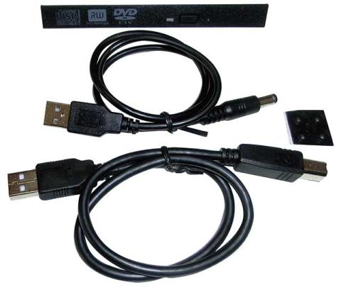 S-ATA Slim Line - USB 2.0変換アダプターを内蔵した筐体以外に、光学ドライブ用のベゼル,USB 2.0ケーブル,USB電源ケーブル(バスパワーで光学ドライブが動作しない時の補助電源),ゴム足,光学ドライブ固定用ネジが付属しています。