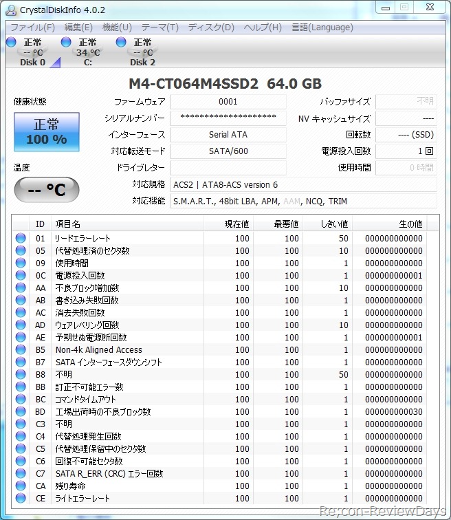 TRIMやNCQ、S.M.A.R.T.に対応しており、使用時間や電源投入回数なども問題なく取得出来ています。(CrystalDiskInfo 4.02使用)
