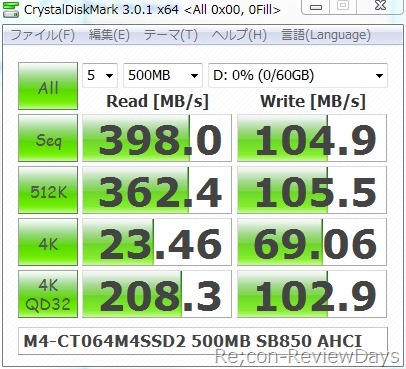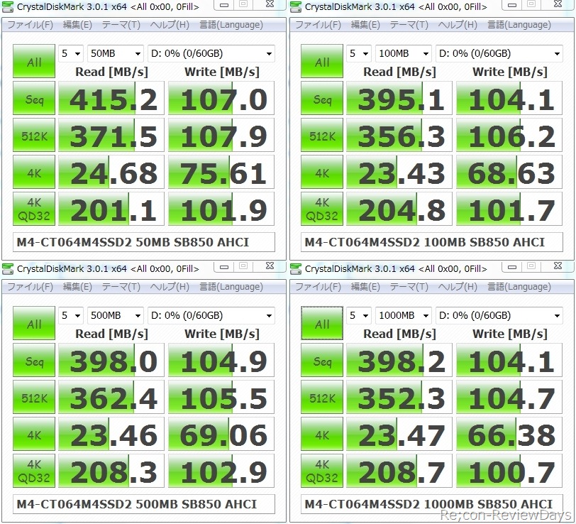 また全体的に最大読み込みが約450MB/sに近いスコアーが出ており公称スペックの最大読み込み415MB/sを超える結果となっています。