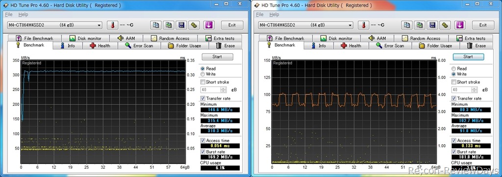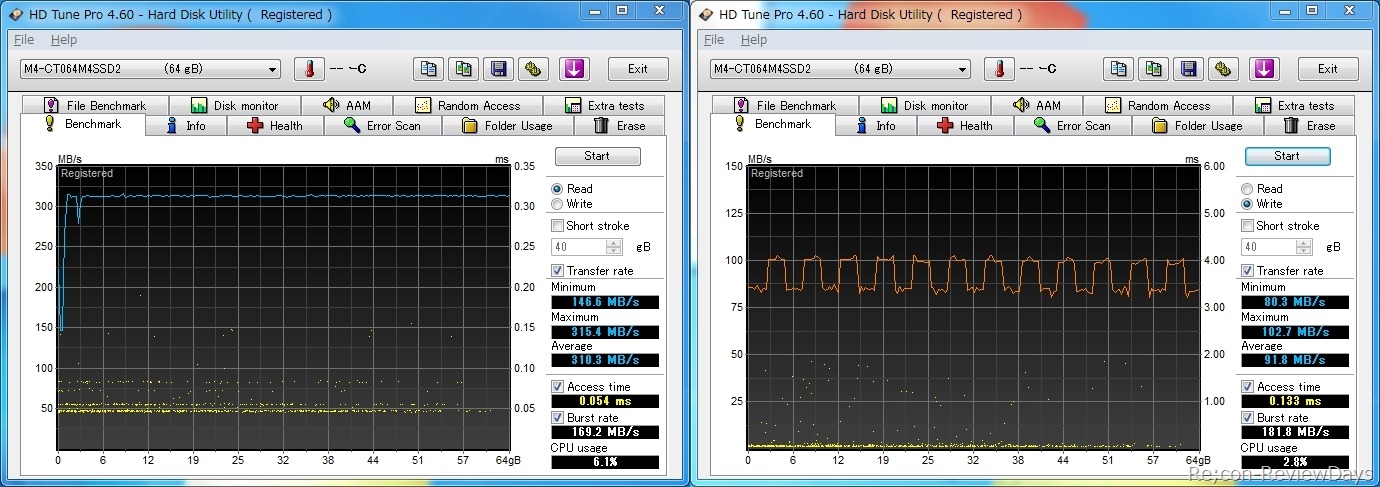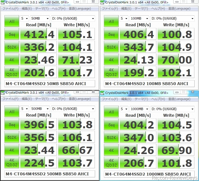 書き込み時では安定していないファームウェアの場合、最低読み込み/書き込み速度と最高読み込み/書き込みの差が大きく、差が大きく開きがちでしたが、CT064M4SSD2に関しては殆ど差がなく完成度の高いファームに仕上がっていることがわかります。