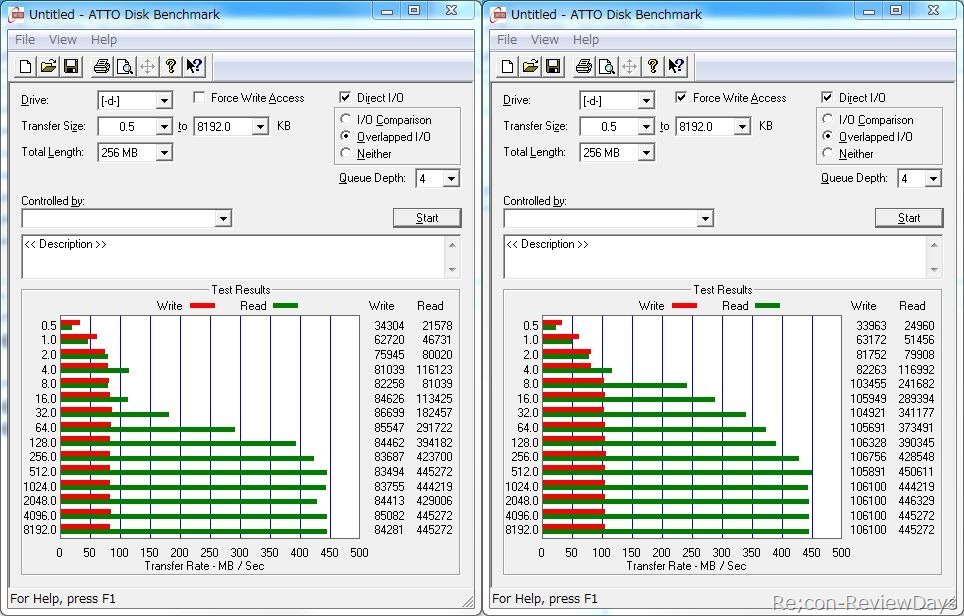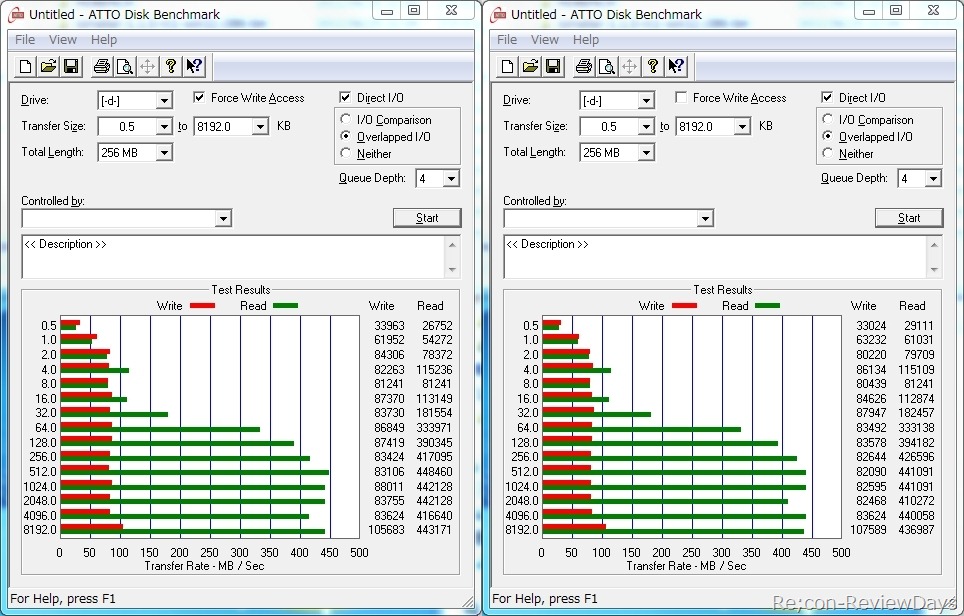 ATTO Disk Benchmark v2.46でTotal Lengthをデフォルトの256MB、Force Write AccessをOFF/ONで検証しています。