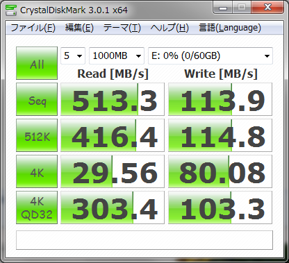 CrystalDiskMarkでのベンチマーク結果をとりました。