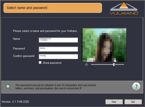 名前とパスワードを設定します。初めは適当につけようとしたら、すでに使われているとエラーメッセージが表示されたのでおかしいなと思って調べてみたら、ここで付ける名前はLAN上でVULKANO FLOWにアクセスするために使うほか、リモート接続でも使うので全てのVULKANO FLOWユーザーからユニークな名前でないといけないようです。DDNSの代わりとなる名前のようです。