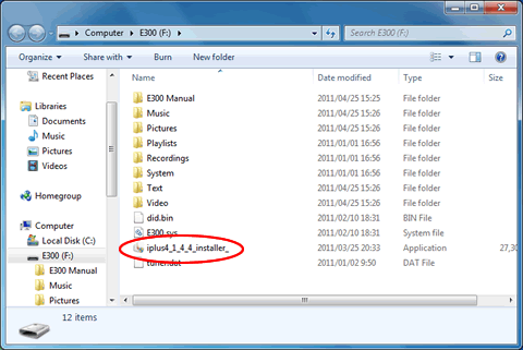 2、リムーバブルディスクとして認識後、エクスプローラーで本体にアクセスし、"iplus4_1_4_4_installer.exe"をダブルクリックします。
