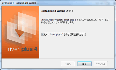 6、InstallShield Wizardの完了が表示されたら、"はい、"iriver plus 4"を今すぐ再起動します。"を選択し、"完了"をクリックします。