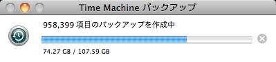 手動計測では最初やや遅く分速0.5GB、中盤は高速で分速2GB、終盤は非常に遅く分速0.1GB以下に落ちる。バックアップ中、進行状況が表示される。初回限定か?分母の107.59GBは、ログと一致しない。