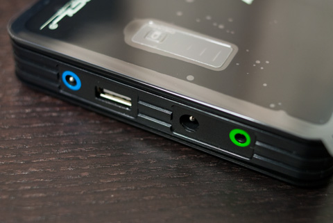向かって右側から10.5V出力ポート(緑)、本体充電用端子、USB 5V出力ポート、19V出力ポート(青)が並んでます。これらのポートは独立している為、複数機器を同時に充電することが可能です。(例えば、ノートPC用の電源として使用しながら、携帯電話等を充電することも可能)