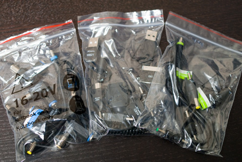 ケーブルとものすごい数のチップが同梱されています。(10.5V用ケーブル×1、10.5V用接続チップ×3、USB用ケーブル×1、USB用接続チップ×6、19V用ケーブル×1、19V用接続チップ×6)