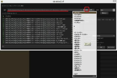 「場所」に音楽CDから取得した情報を元に、アルバム名、アーティスト名、タイトル(曲名)などをファイルに添付してそれぞれの曲の保存が出来ます。
