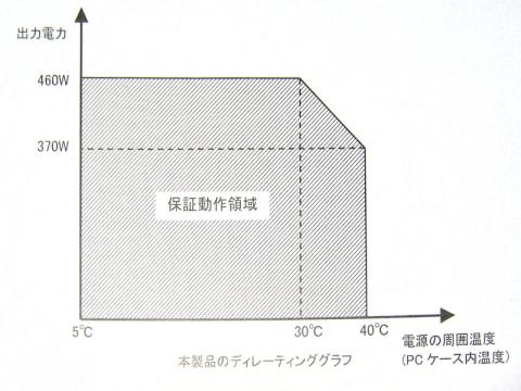 ・定格の460w電源として使用するには電源周辺温度が30度以下である必要があります、CPUの廃熱にも注意するように書かれています。