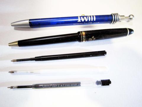 写真の白い軸はIwillロゴ入りに入っていたもので、黒い軸はナンジャタウンのボールペンに