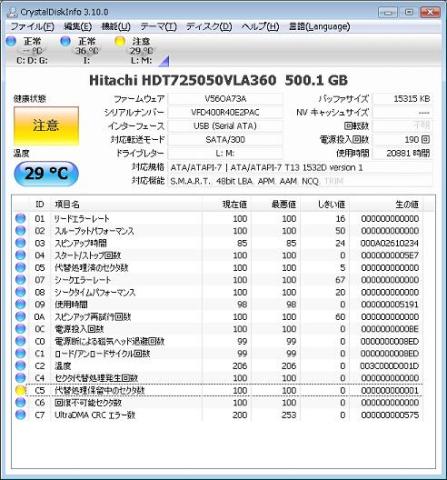 CDI情報を取ってみると、使用時間が20881時間ちょっとから26940時間に、6000時間も増えたが、代替処理保留中のセクタ数が1→0となり、注意マークが消えた!しかも、電源オンの回数が11回しか増えなかった!不思議だ。自己回復力でもある?あるいは、Windows7の「隠ぺい力」の結果?
