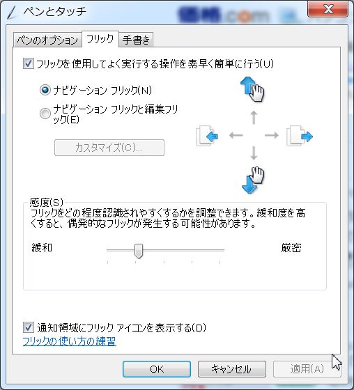 デフォで、操作が難しい方には、「フリック」アイコンから「コントロールパネルのフリックを開く」でプロパティの設定変更が可能です。