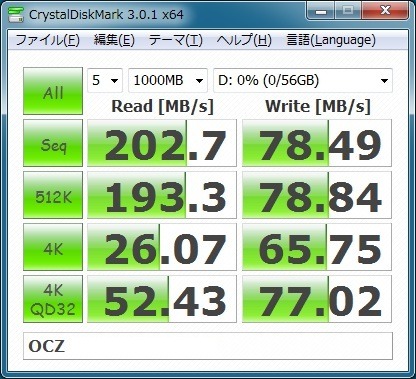 圧縮SandForce製なので公式サイトや他レビューを見てもゼロフィルは早いがランダムは遅い。