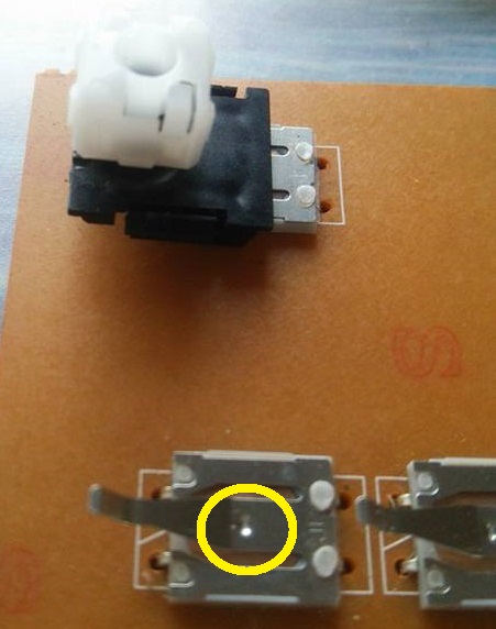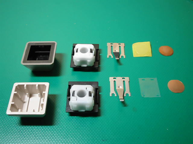 この板バネスイッチ、黄色で囲った部分のツメの出っ張りがキートップにぶつかる/ぶつからない、ぶつかる場所で音の大きさの差をつけてる・・・・・・・ような気がします。あとはキートップのサイズ/形状もありますけど。