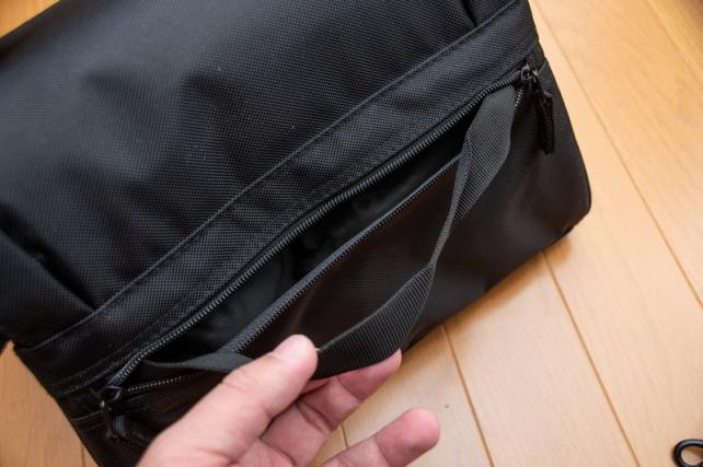 背面にジッパーがあって、開けてみるとキャリーバッグ用のベルトのようです。益々オフィス向きという感じですね。