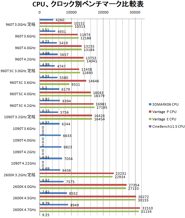 定格の3.0GHzから3.6GHz、4.2GHzに分けて3DMARK06、Vantage Perfomance、Vantage Extreme、Cinebench 11.5を検証結果です。