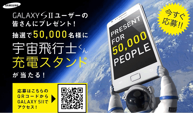 GALAXY SIIの専用ブラウザーからキャンペーンサイトの必要事項にご入力の上、ご応募いただくと、抽選で50,000名様に「GALAXY SIIオリジナル宇宙飛行士充電スタンド」が当たります。