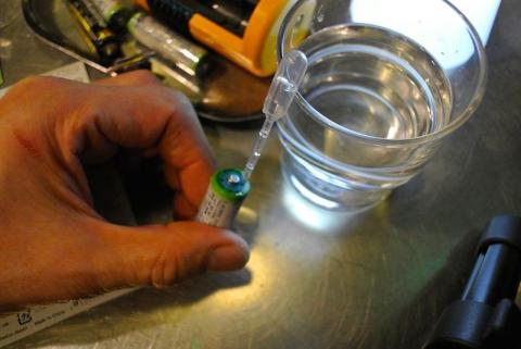 付属のスポイトを使い、プラス電極側に開けられた小さな穴(ふたつ)の片方から少量の水を注水します。 0.5cc~1.0ccが適量です。