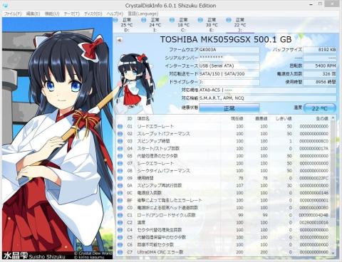 早速CrystalDiskinfoを使い、内蔵HDD情報みてみましたが、東芝製MK5059GSX 500GB 5400RPMが使われていました。
