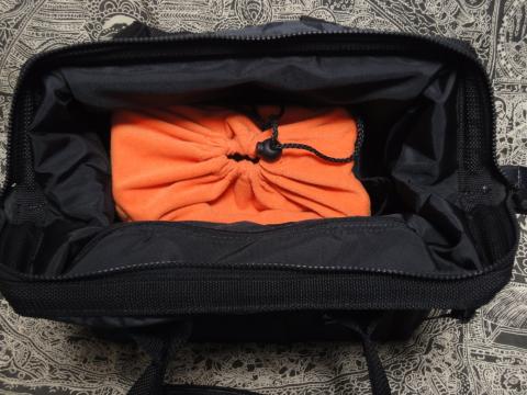 中は、マジックテープで固定された仕切りが2枚付属してますので、カメラ+レンズ、レンズや小物を入れる事が出来ます。