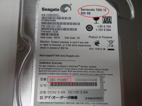 IOの型番シールよりもSEAGATEのBarracuda 7200.12 "500GB" の文字でした(汗