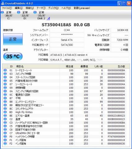 ツールが起動すると接続されているHDDの型式、シリアルナンバー、ファームウエアのバージョン等が他メーカの物も含めて表示されます。