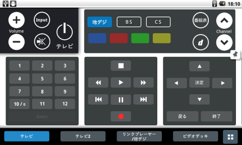 学習リモコンでない上に、詳細な型番を指定して設定できるわけではないので、あくまで「最大公約数的な機能にしかアクセスできない」というのが非常に痛い。また、ユーザーインターフェースも、あくまで「最大公約数的な機能にアクセスできるよう」に、どの機器を利用してもインターフェースが変わることは無く、どんな機器を利用しても基本は上の画像のままである。