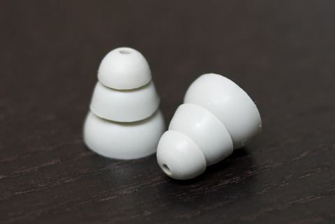 純正のイヤーチップは柔らかくて気持ちイイんですが、遮音性が全くと言って良いほど無く、地下鉄等で使用するのはかなり困難です。。(まぁ、地下鉄ではダイナミック型のイヤフォンも厳しいですが。。)