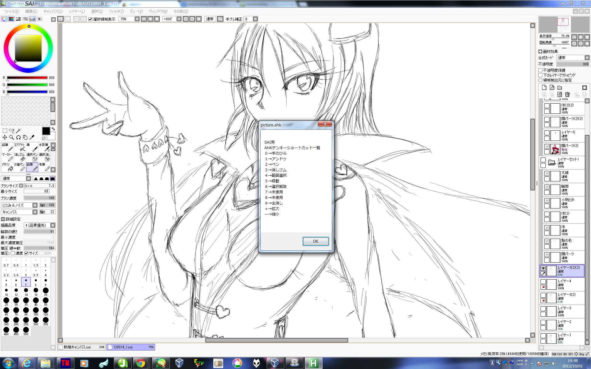 NumpadDot::MsgBox SAI用'nAHKテンキーショートカット一覧'n0→手のひら'n1→アンドゥ'n2→ペン'n3→消しゴム'n4→範囲選択'n5→移動'n6→選択解除'n7→未使用'n8→未使用'n9→全消し'n+→拡大'nー→縮小'n'n