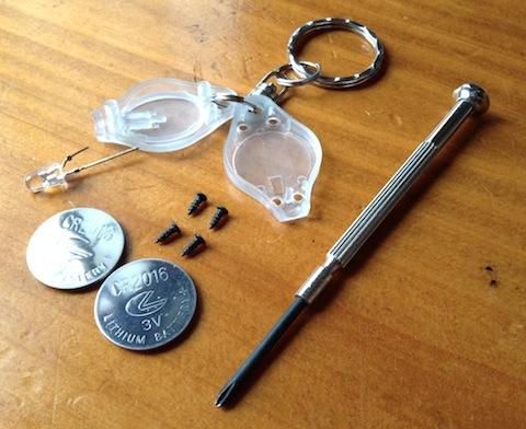そこで100均で売っている同型のLEDライト付きキーホルダーを購入して、本体のみを交換する事にしました。表現的には本体交換としましたが、どちらかというと100均モノに紫外線LEDを組み込んだというのが正解かも知れません^_^;