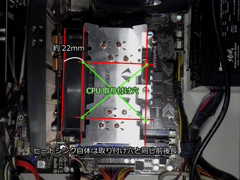 まあ、「見本どおりの付け方」はできなさそうですが、ヒートシンク本体が干渉する訳じゃないので工夫次第でなんとかってところでしょうか。