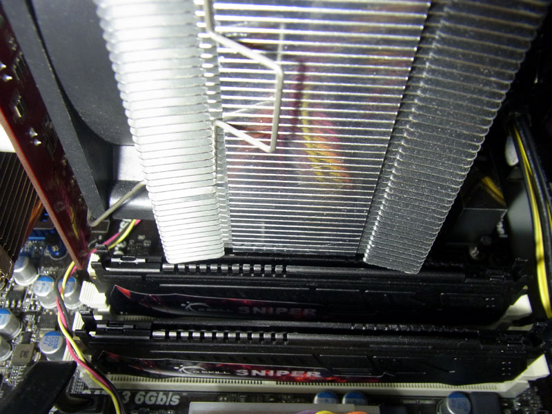 ただこれ、ファンがシンプルなクリップ式なので、ファンだけ上にずらして装着するという荒業ができます。以前NINJYA3でもやってたんですが、ファンのクリップ取り付け位置をずらして、メモリにひっかからない位置まで上げるという荒業ですが、ETS-T40のクリップ形状なら2cmくらい上までファンをずらせます。